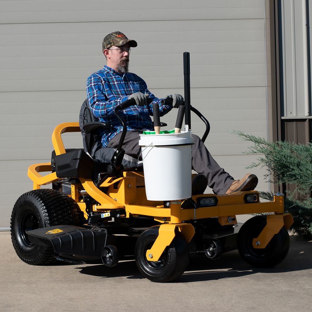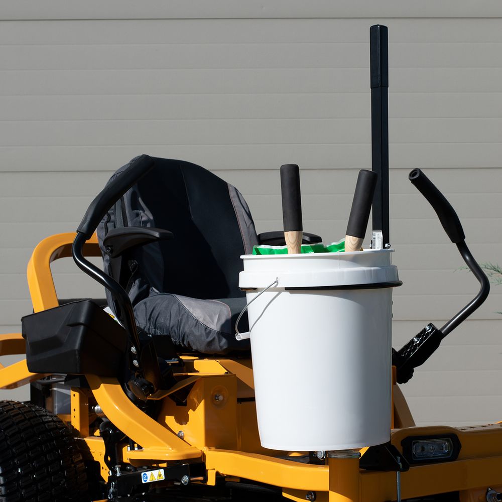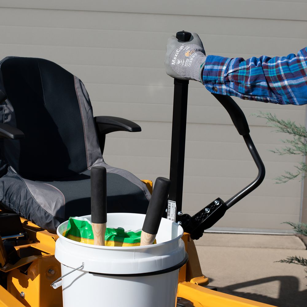 This Zero Turn Bucket Holder with Handle attached to mows zero turn mowers and allows a 5 gallon bucket to be inserted to hold tools, lawn debris or other items